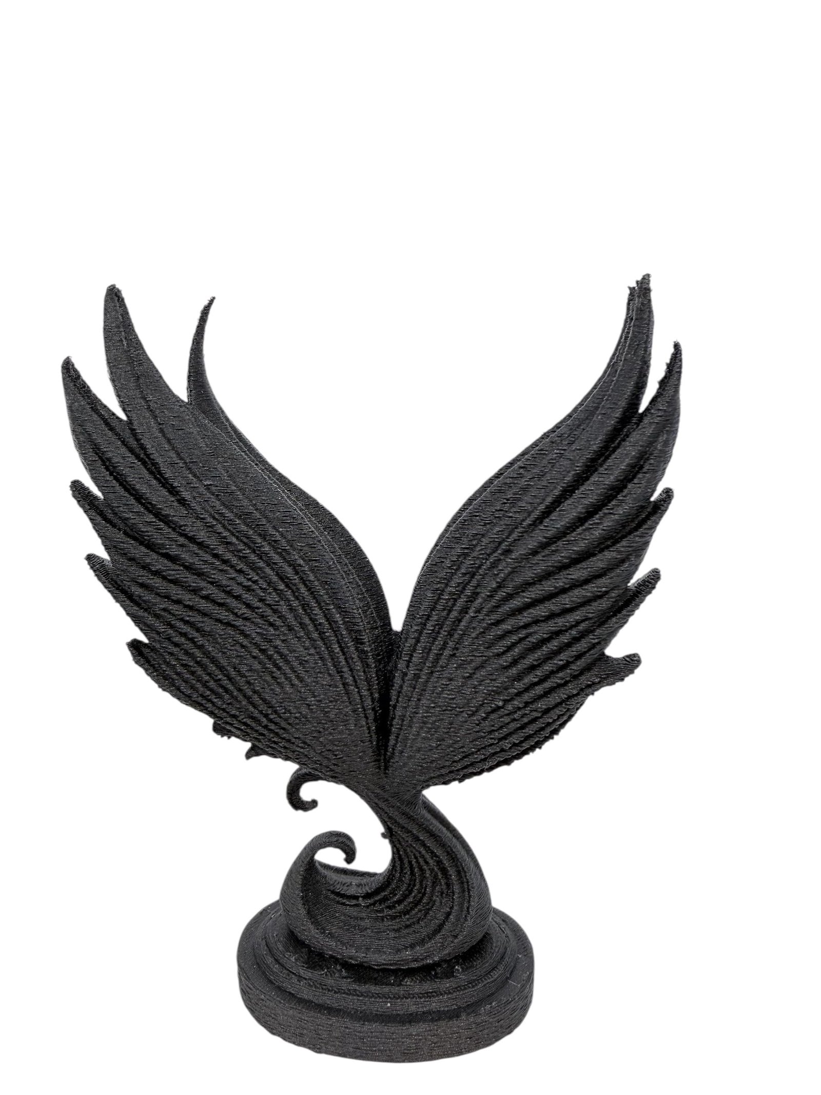 This striking winged heart sculpture makes a powerful statement for Valentine’s Day and beyond. Handcrafted to order in the UK by 3D Print and LaserCraft from a design by 29flo, this dramatic piece features bold black wings that spread protectively around a textured silver heart, symbolising love taking flight. Standing approximately 20 cm tall, the sculpture showcases intricate feather detailing and a baroque-inspired swirling base that adds elegant movement to the design. Crafted from durable PLA material using advanced 3D printing techniques, each piece is freshly produced for every buyer, ensuring you receive a brand new sculpture made especially for you. The gothic romantic aesthetic combines dark drama with tender sentiment, making it perfect for Valentine’s Day gifts, anniversaries, or as year-round romantic décor. Light layer lines may be visible as a natural characteristic of quality 3D printed artwork. Securely packaged and dispatched with tracked delivery to ensure safe arrival.