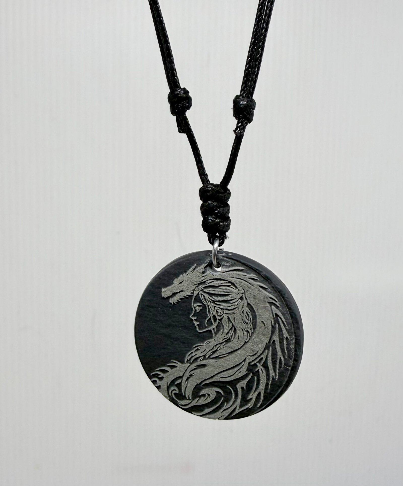 Discover authentic British craftsmanship with this handmade Welsh slate dragon and female head pendant, carefully produced by 3DPRINT AND LASER CRAFT in the United Kingdom. Featuring a detailed raised Celtic design, this 28mm round medallion combines natural stone texture with gothic fantasy styling.