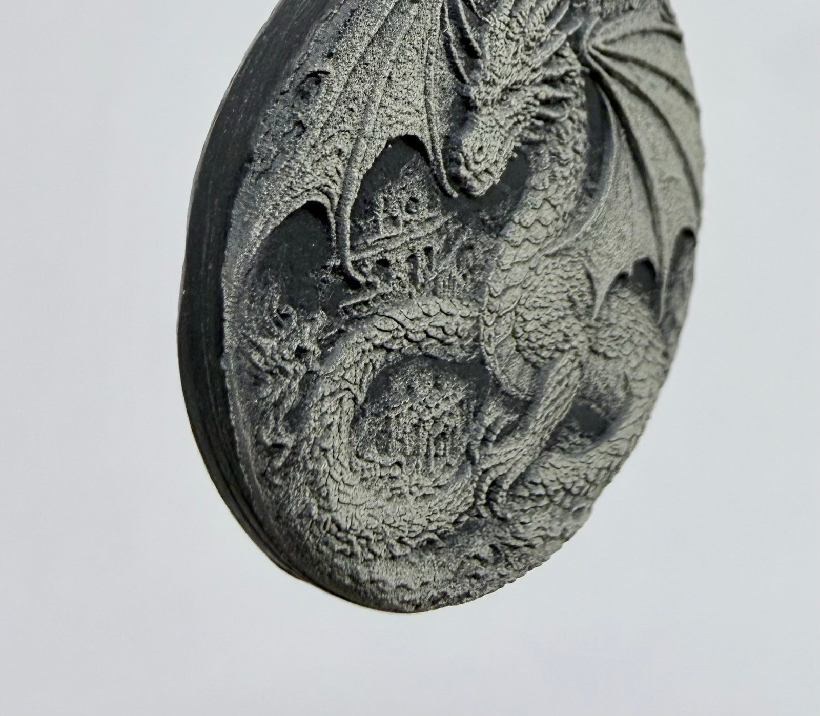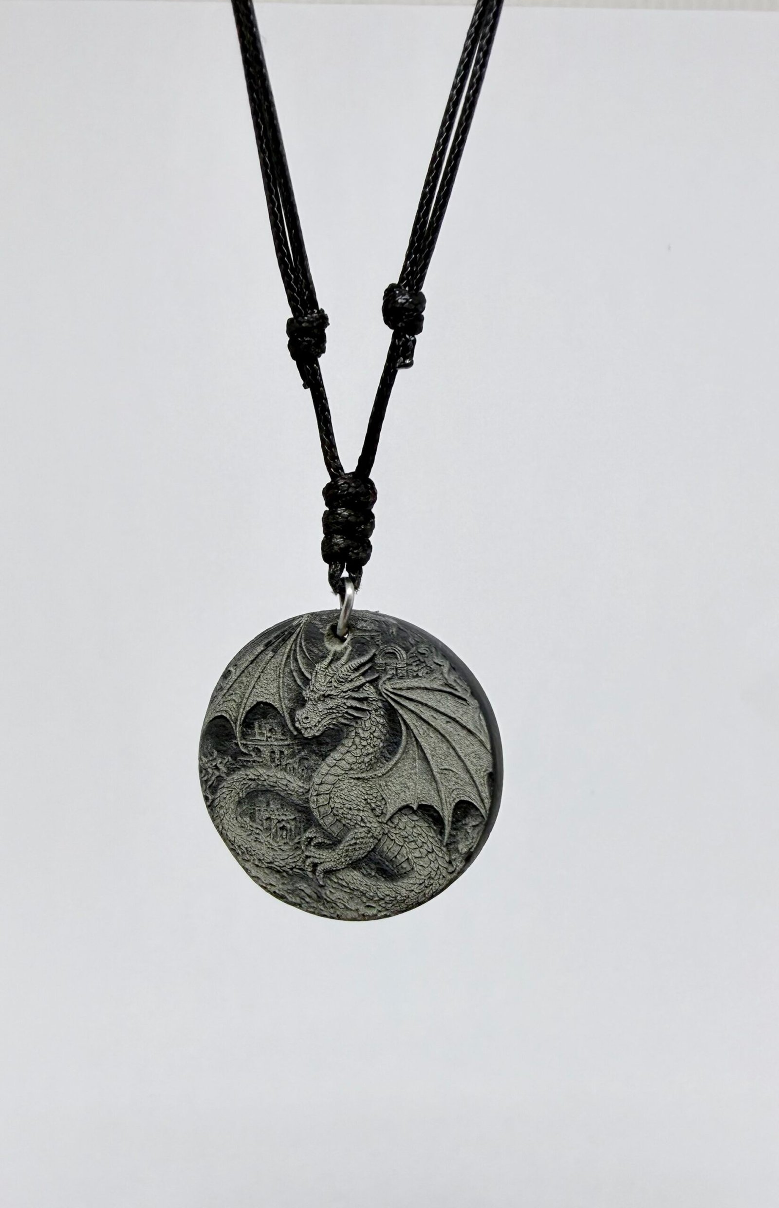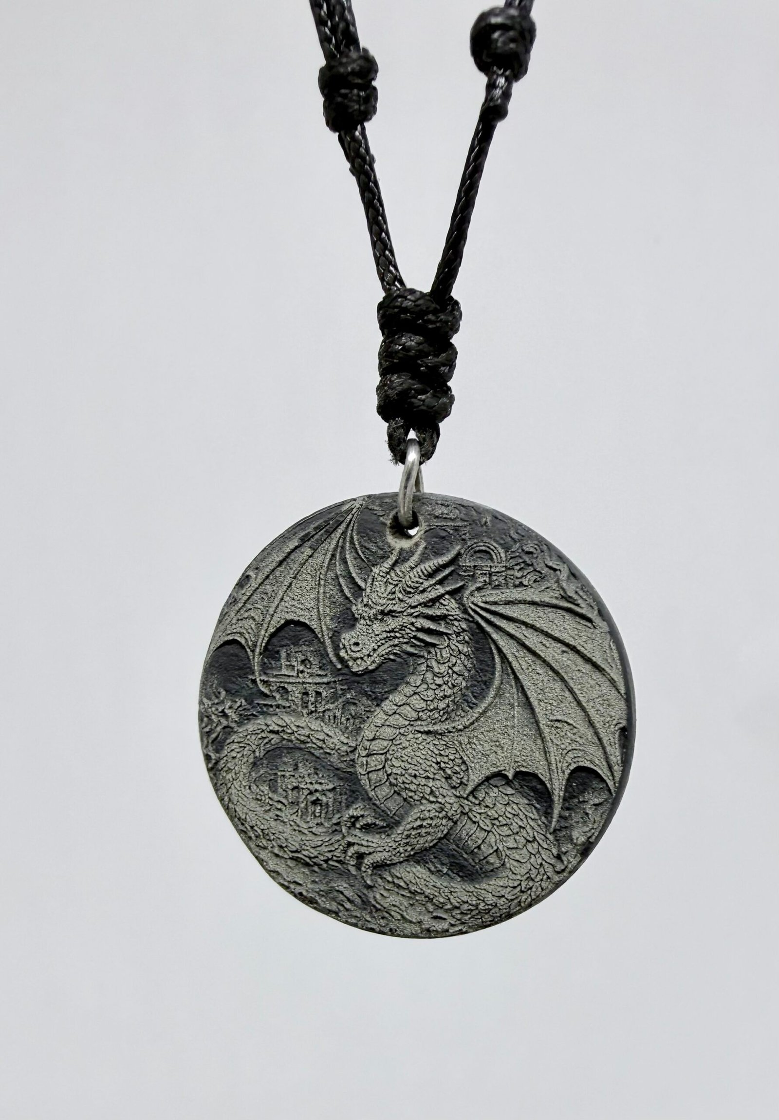 Handmade Welsh slate dragon pendant approximately 30mm diameter on black leather adjustable necklace, 40 – 70 cm.